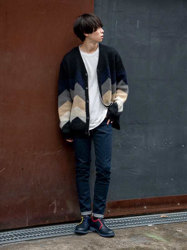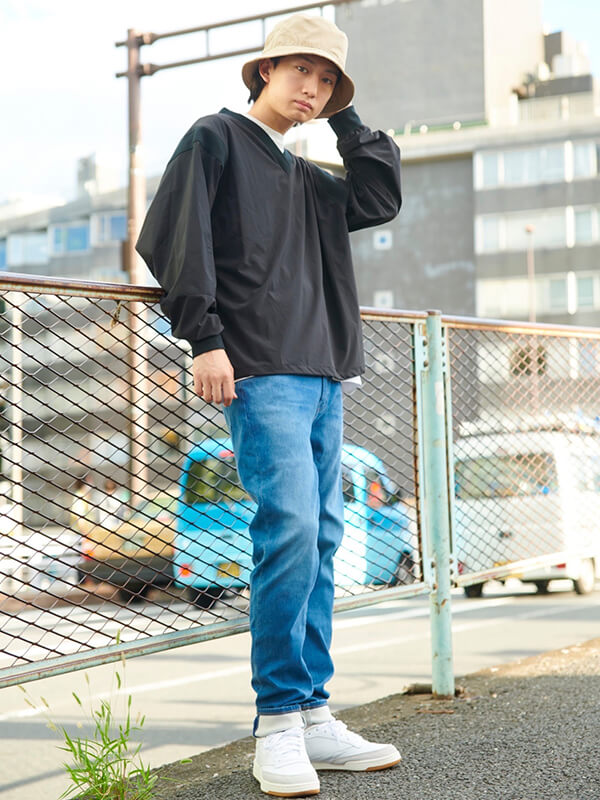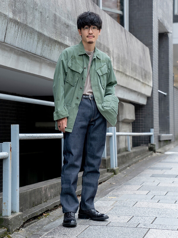 上半身に厚みのある骨格ストレートの人は縦長のIラインシルエットが上手。ハリのある厚手のストレートシルエットのジーンズでジャストウエストで履いてスタイルアップを狙っている。Vネックなど首が広く開いているトップスやハリのあるジャケットと合わせたキレイめスタイルがお似合い。