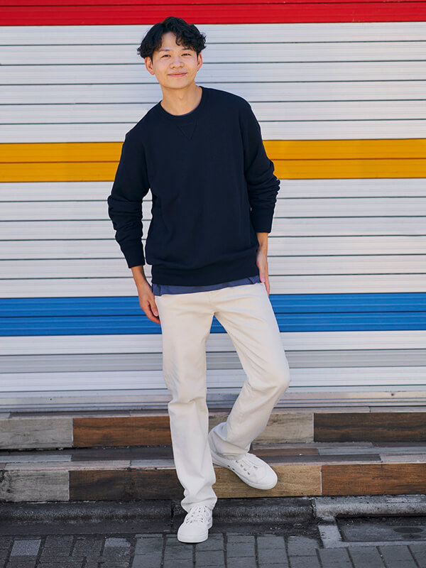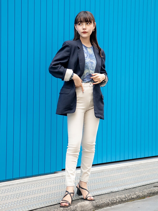 骨格ウェーブの人は、フェミニンカジュアルが得意。スキニータイプを選んでボディラインを出して着ている。トップスは軽やかなシアー素材や華やかなデザインのものをチョイスして、目線を上へ、がポイントのよう。骨格ウェーブの男性は、華奢に見えないように、あえてボリュームのあるトップスを選ぶ傾向に。