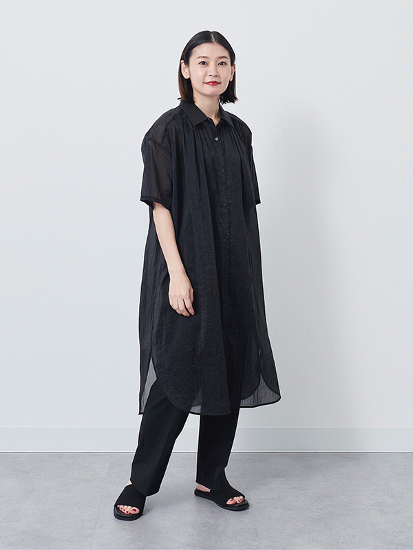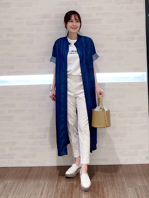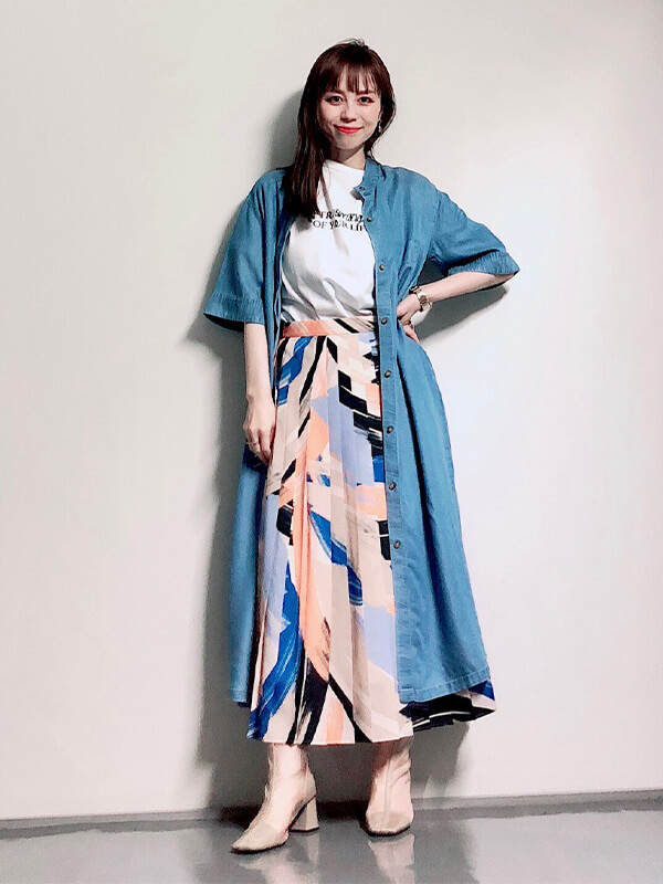 店舗ではお客様からの信頼も厚いPLSTスタッフのMikaさん、Honamiさん、Eriさんは、ロゴTをボリューム感あるフレアスカートやワンピースにプラスして、 可愛らしさをほどよく引き算。こなれたフェミニンコーデの提案が上手い。シャツワンピを無造作に羽織ったり、袖をくるっと腰に巻いてロングスカートとして使うなど、今すぐ真似したい着こなしテクも随所に。