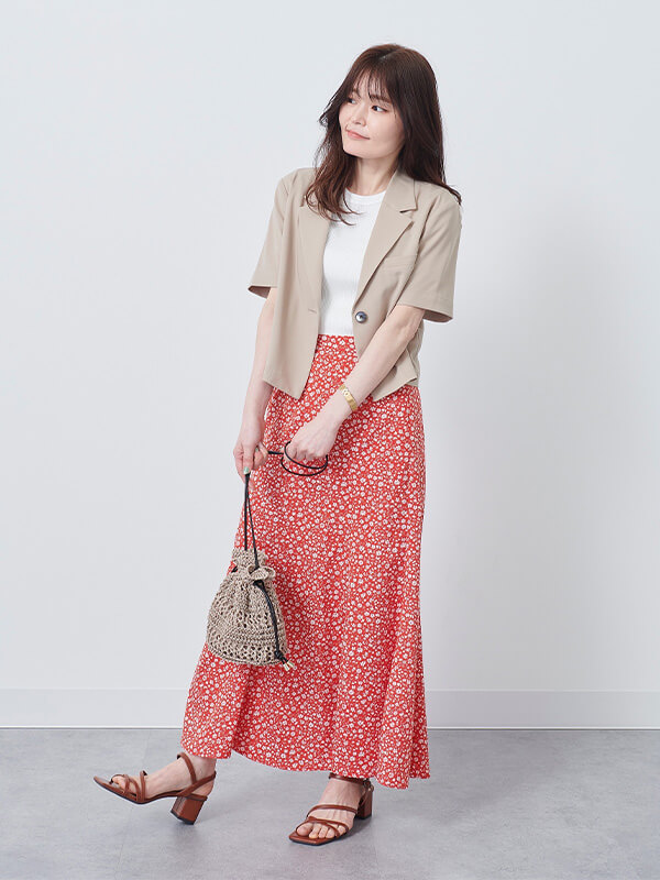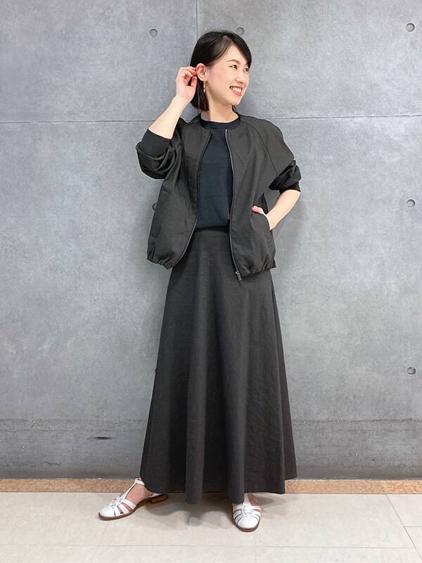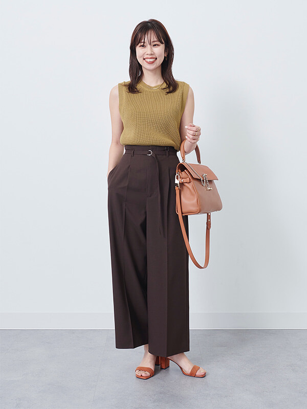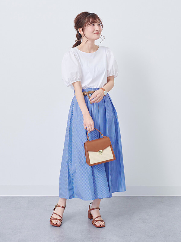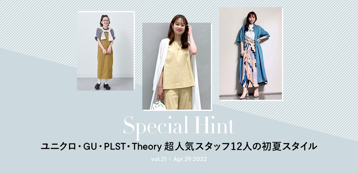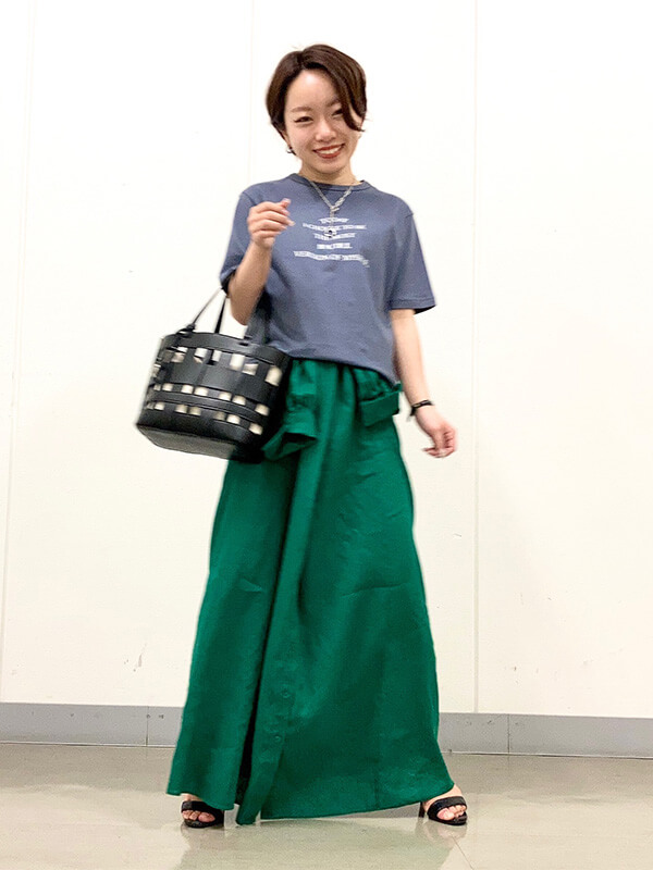 フォロワー増加中のGUスタッフ、Erinaさん、Natsukiさん、Shinaさんはトレンド上手。ミニTブームに乗って、トップスはあえてジャストサイズを選んでボトムにイン。トップスをコンパクトにした分、ボトムはフレアロングスカートやワイドパンツで、ピタピタすぎない大人なAラインシルエットに仕上げている。小物を夏映えする上品ブラウンで揃えているところも高ポイント。