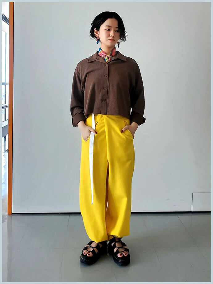 モード学園のカラー上手たちは、秋冬の注目色イエローに注目。ビビッドなイエローやこっくりとしたマスタード系など思い思いのイエローをメインに持ってきて、華やかでポジティブな夏秋ミックスコーデを投稿。パンツは少しゆるっとしたリラックス感あるシルエットを選ぶのが今っぽい。トップスにブラウンを合わせると秋感が加速。