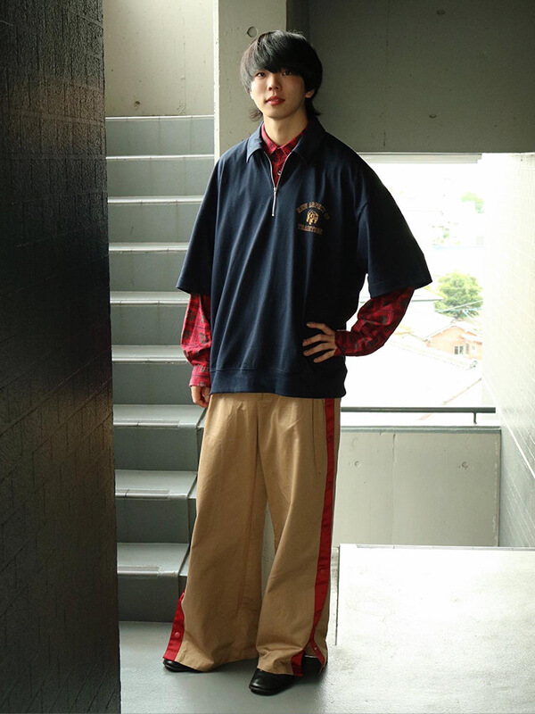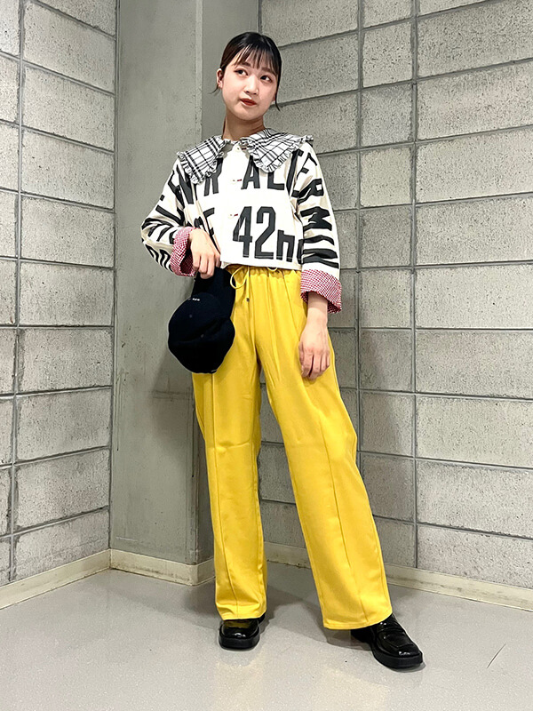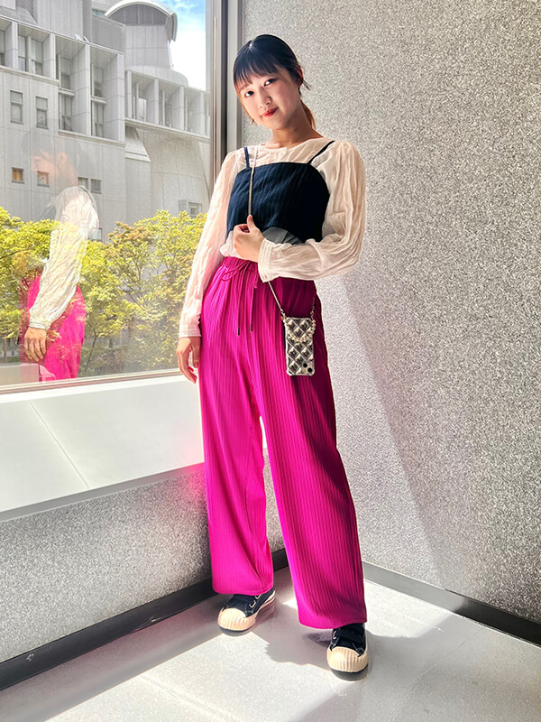 トレンド上手な学生は、Tシャツをシアー素材やフリルブラウス、チェック柄のシャツにスイッチ。秋に流行る素材、柄を取り入れて、ほんのりレトロな雰囲気の夏秋ミックスコーデを完成させてる。それぞれカラーパンツやスニーカー、ワイドパンツなどで抜けを作って、型にはまらない自由なスタイルに仕上げている点にも注目。