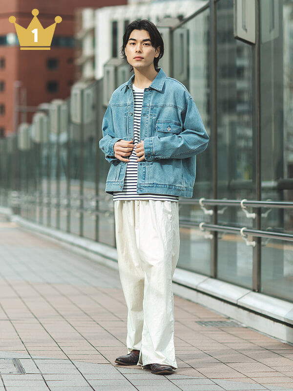 WOMEN1位のロングジレはブラックワンピースとの組み合わせで縦長Iラインの美シルエットが加速。MEN1位のデニムジャケットはホワイト系ボトムスとのコーディネートで全体を優しい色合いにまとめるのが差のつくポイント。