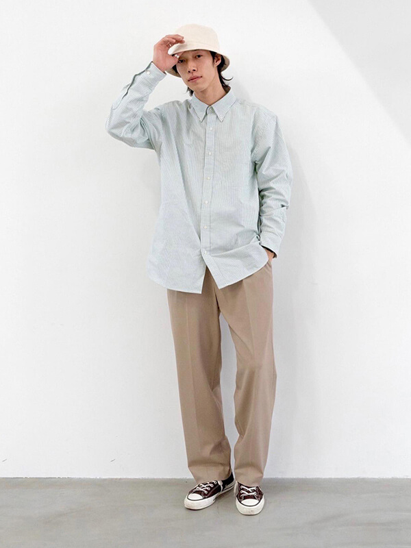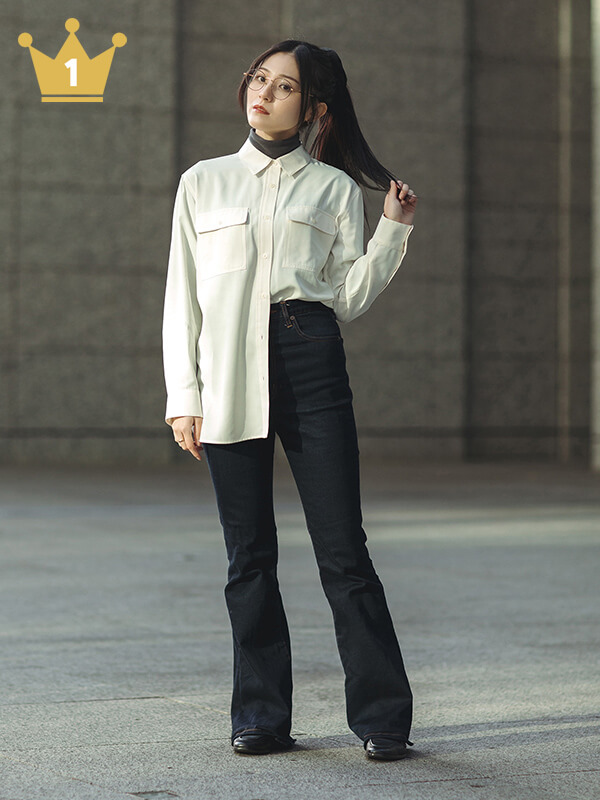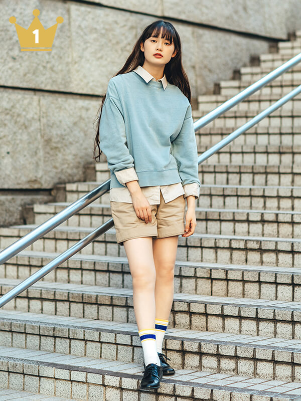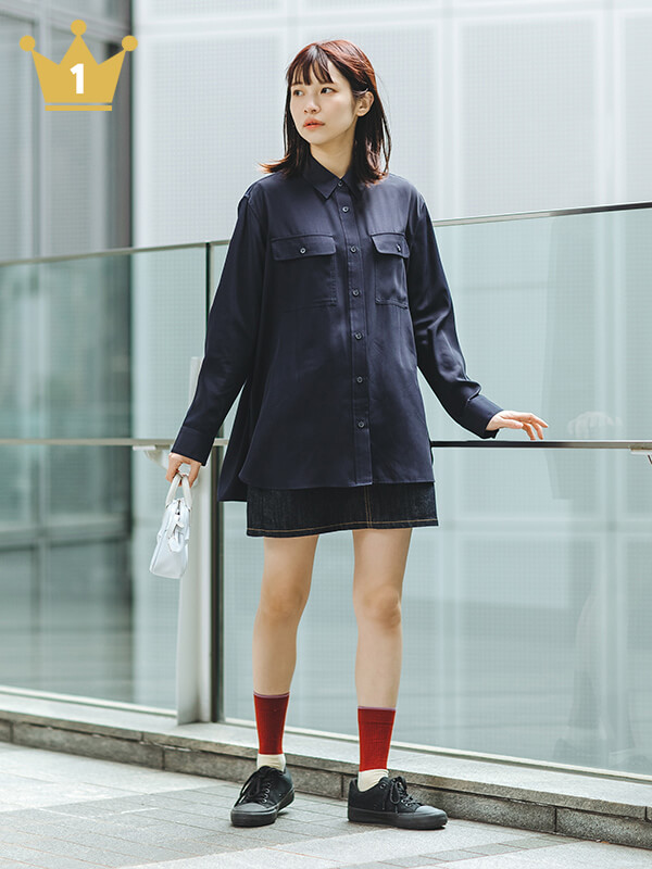シャツ部門1位はUVカットシャツ。しなやかなドレープ感がアクセントとなるので、着こなしはシンプルにモノトーンで。ソックスやシャツの下に着たハイネックの色で、控え目に遊びをプラスしているところに注目。