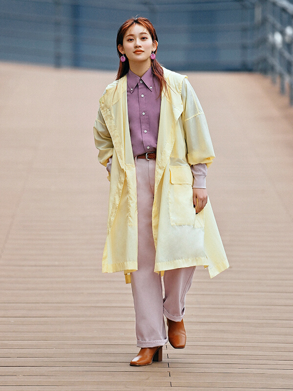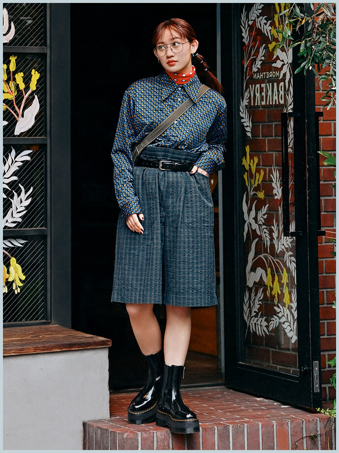 佐々木莉佳子の私服は柄やビビッドカラーが定番。それでも品よく決まる秘訣は、上下アイテムの色合わせにあり。お気に入りのレトロな柄シャツ(上)には、Uniqlo Uメンズのワイドフィットイージーショーツを同じ青系で揃えてミニマルなボーイッシュスタイルに。黄色のパーカ&スラックス(左下)で攻めた日も、上から重ねたUniqlo U Vネックカーディガンのクリーム色で程よくなじんだ仕上がりに。ロンT&ジーンズのピンクと淡い紫シャツで流行りのシャーベットカラーを楽しみたい日(右下)には、透けるイエローのUniqlo Uナイロンポンチョが主役アウターとしてマッチして洒落映え大成功。