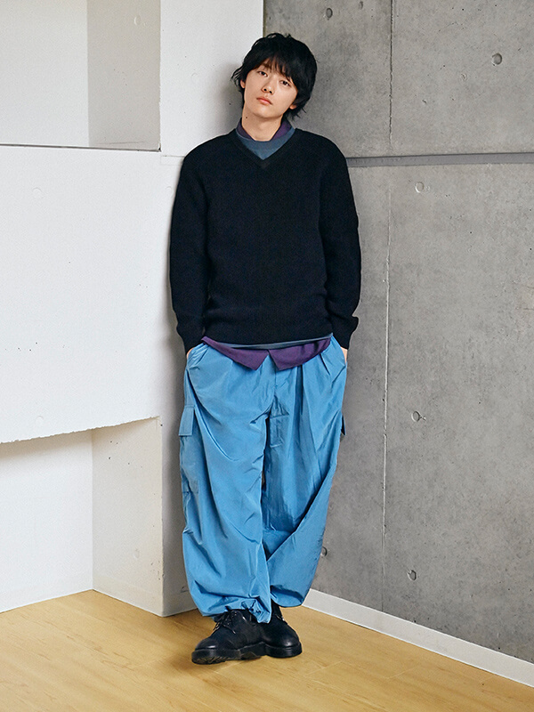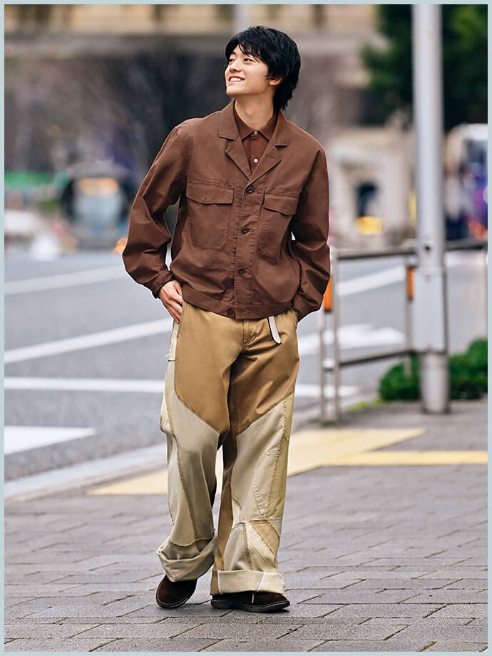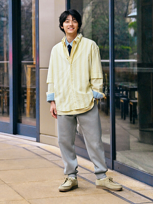 Uniqlo Uのデザインは首元Vゾーンにも特徴があって、シャツスタイルを定番とする櫻井海音の今回のコーデでも差のつくポイントに。Uniqlo Uらしいブラウンでトップスをまとめた1スタイル目(上)は、Uniqlo U ショートジャケットの高いラペル位置のお陰でVゾーンがシャープな印象。2スタイル目(左下)のリラックススタイルな1日は、Uniqlo U Vネックセーターの程よく開いたVネックから中に着たTシャツとシャツのラインがきれいに見えてきちんと感獲得に成功。最後の淡い色のシャツレイヤードで遊んだスタイル(右下)も、上に着たUniqlo U シアサッカーオーバーサイズシャツの大きめなボタンダウン襟の立ち具合が整っていて、レイヤードの首元を引き締めている。